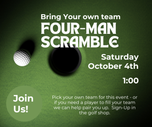 Three/Four-man Scramble. Every hole is modified to Par 3 distances. The format is played by a team of three or four players where each member hits their ball throughout the match. Team captains choose the best shot from the shots played and that is continued until you finish the hole. The process continues until all 18 holes are completed. Winnings go towards the Merchandise Money List. Sign up and teams will be made by the Pro.
